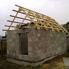 На крыше мы тоже сможем экономит, сделав её простую, наклонную, для чего одна сторона стен ложится выше другой. При возведении стен, вначале монтируются несущие балки потолка, а затем ложится один или два, по вашему усмотрению, ряда блоков, чтобы получился наклон крыши. На установленные несущие балки крыши монтируется обрешётка. При небольших размерах, для балок могут подойти и стропила сечением 50х150мм. Крышу можно покрыть не дорогим, экологичным и практичным ондулином. Как видите между потолком и крышей образуется небольшой чердак, который будет служить дополнительным изолятором.